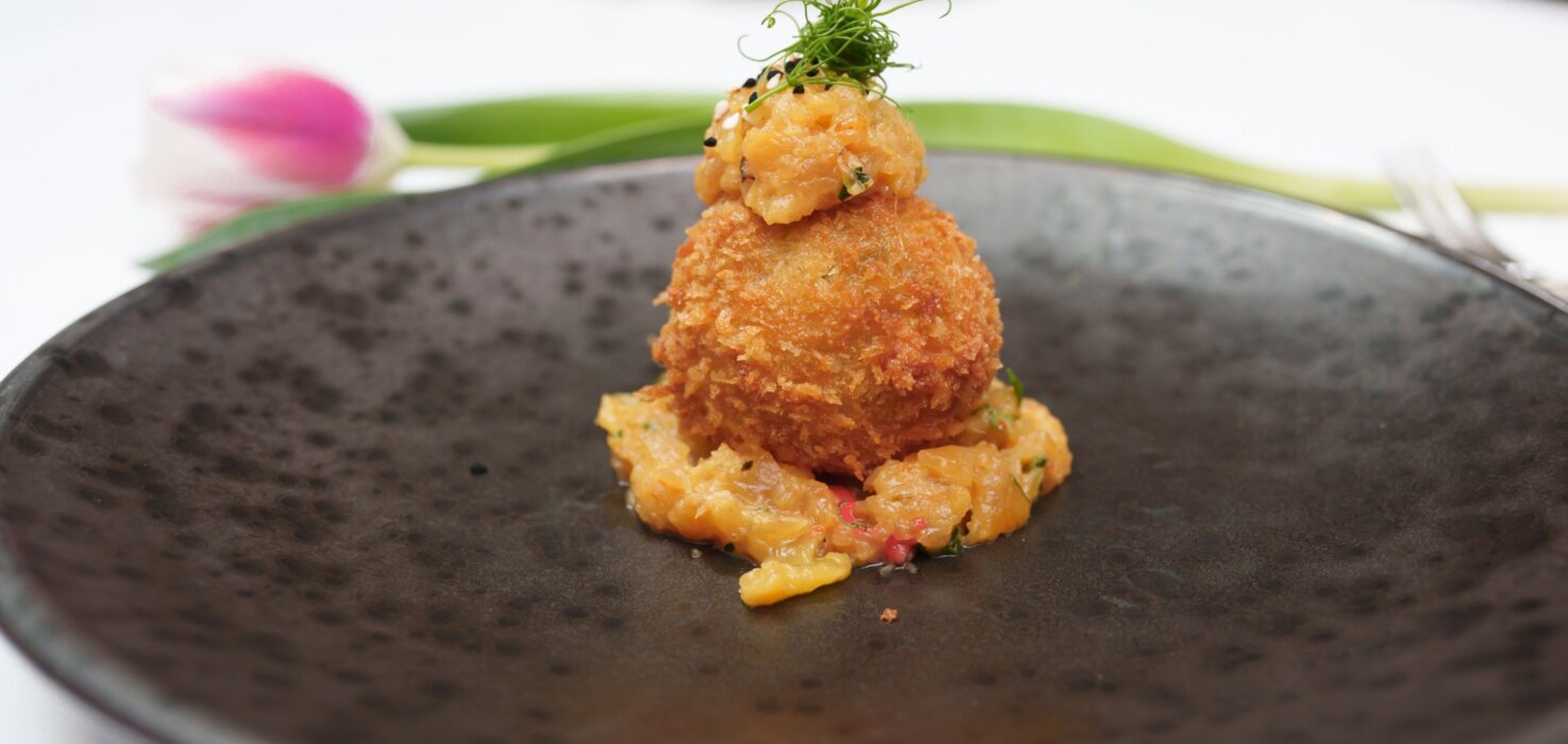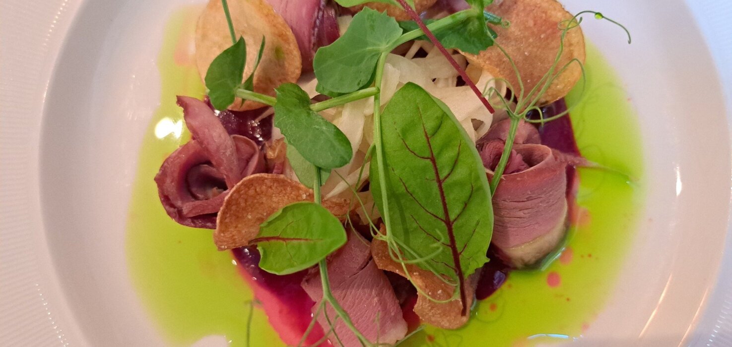 Łosoś pieczony w niskiej temperaturze, sałatka z fenkuła, puree z selera, oliwa ziołowa z kawiorem